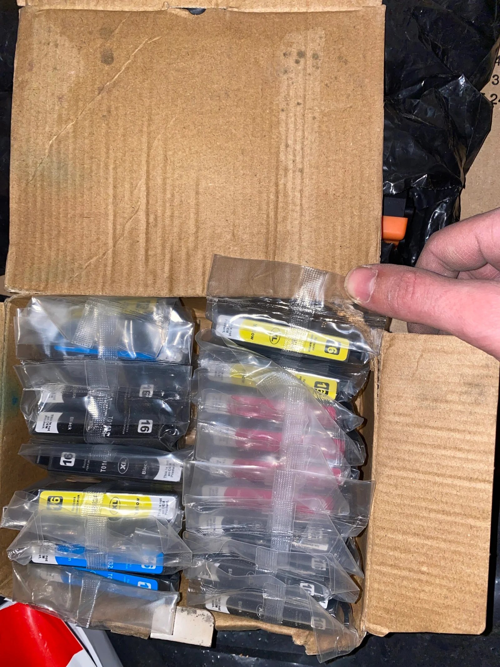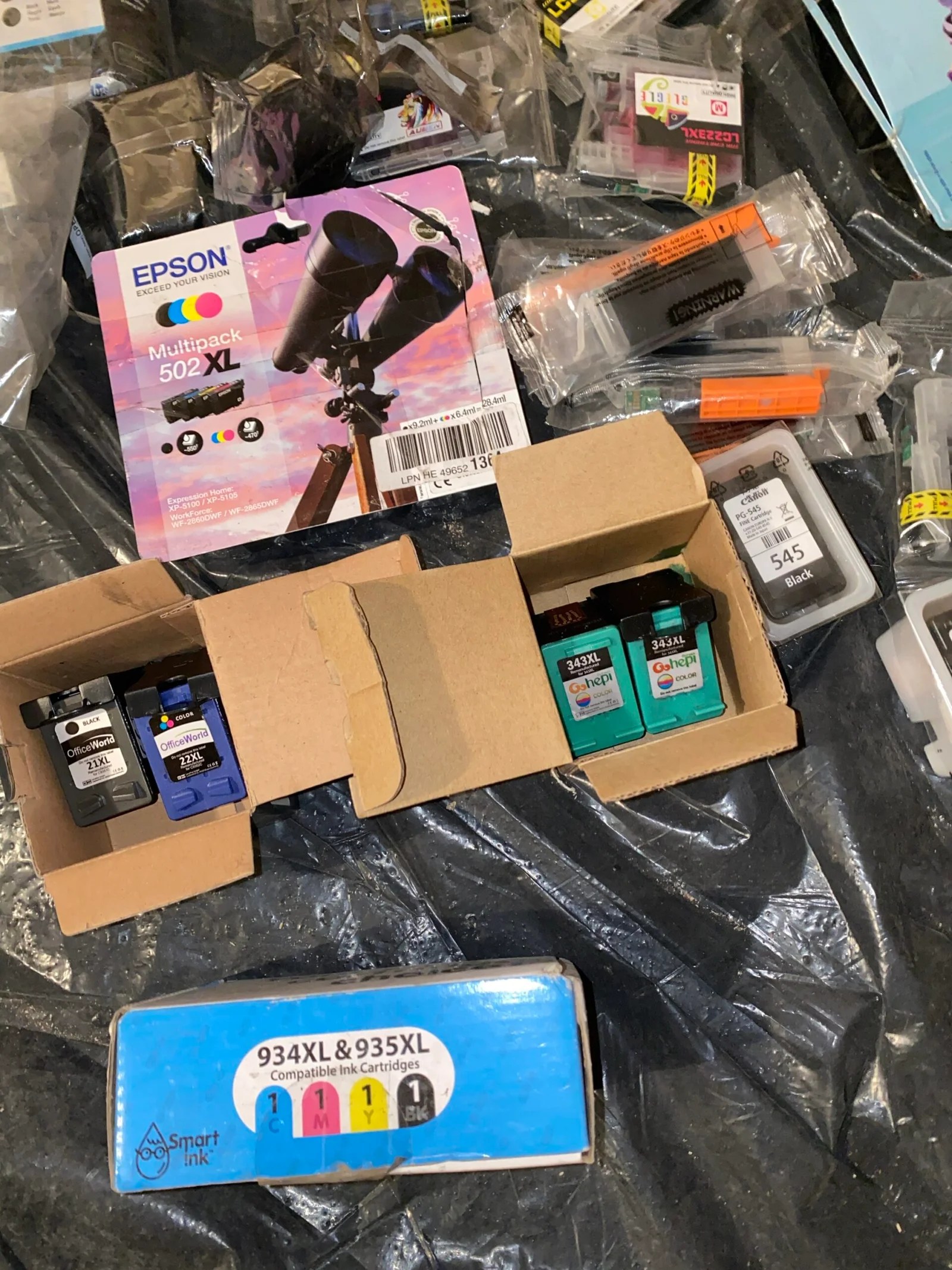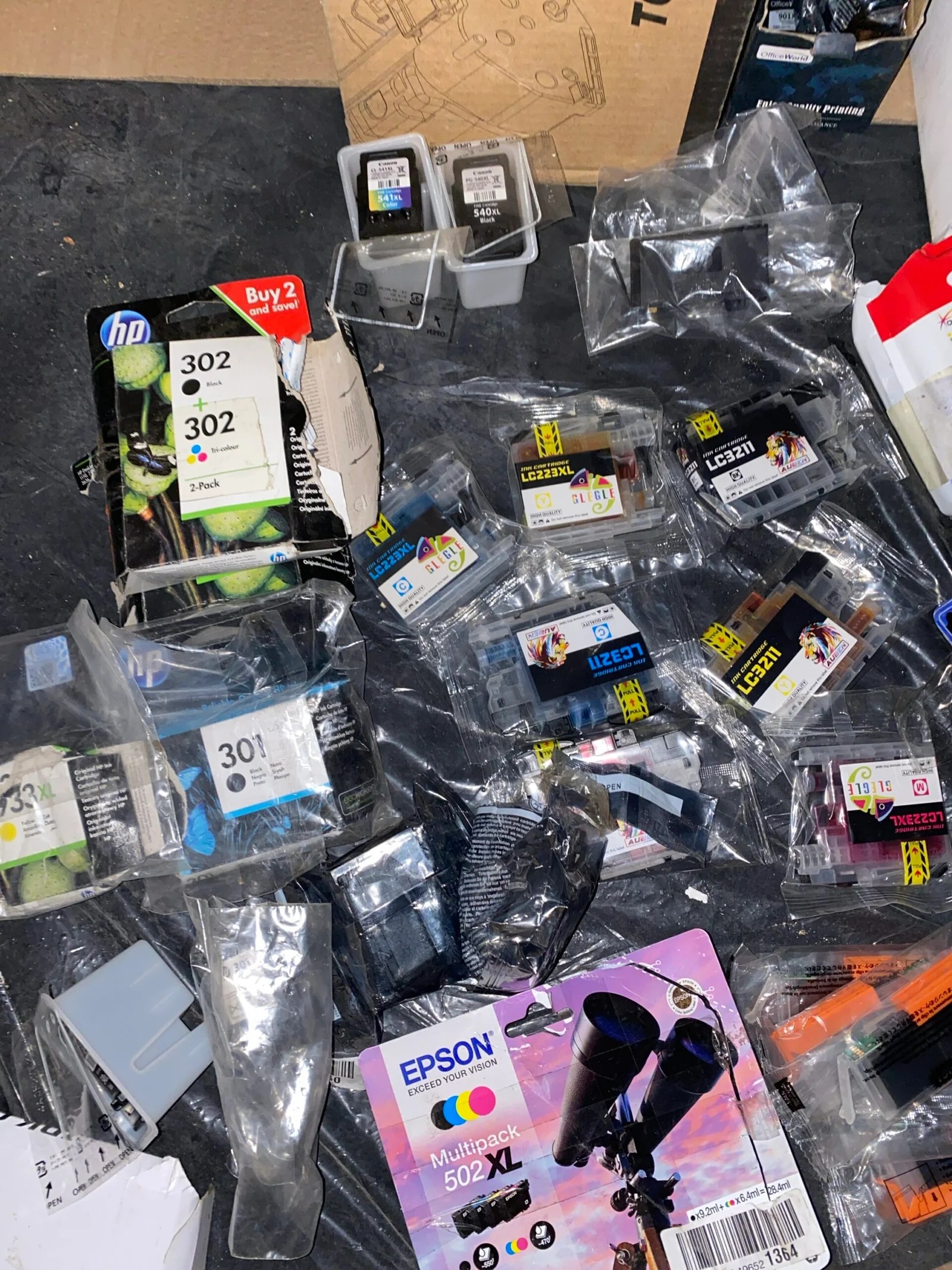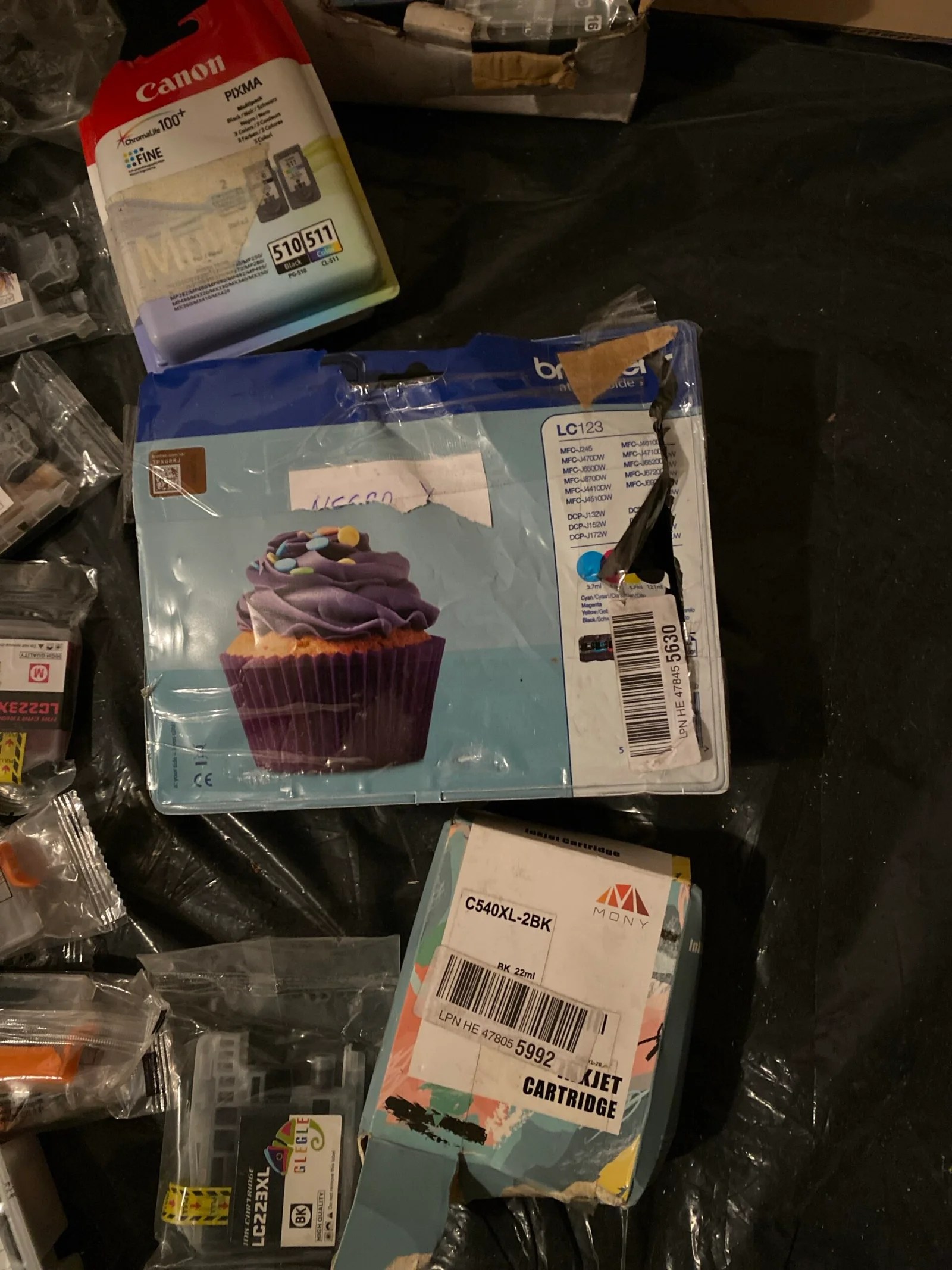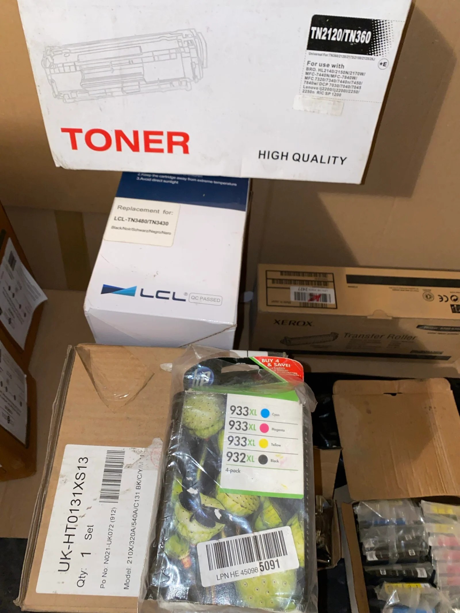 Įvairūs toneriai, spausdintuvų rašalo kasetės. Kai kurie praimti, kai kurie nepraimti.